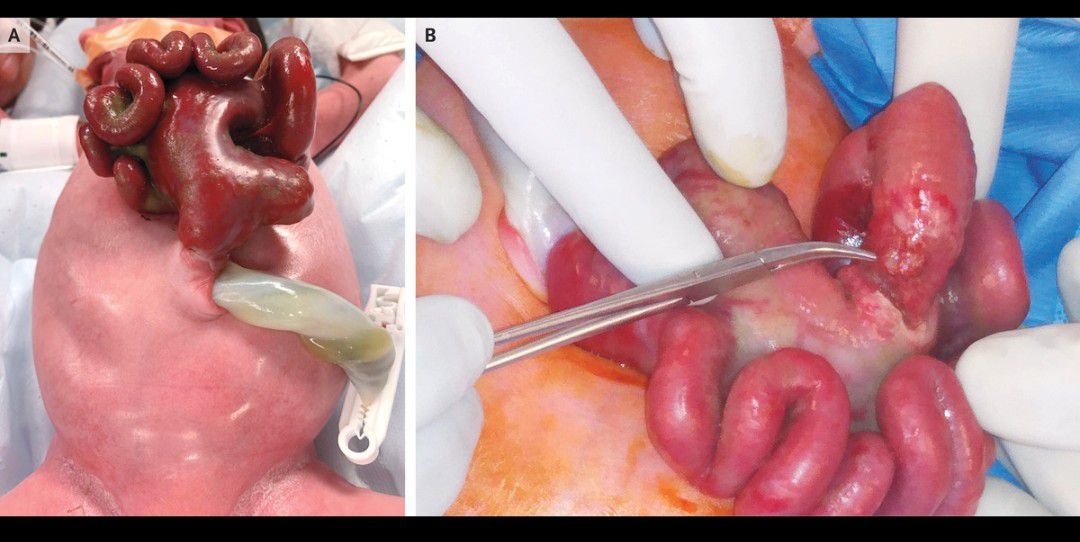 In a male neonate born at 37 weeks of gestation, a narrow stalk of small bowel and proximal colon protruded through a 1.5-cm defect in the abdominal wall. A diagnosis of gastroschisis had been made antenatally on the basis of findings from prenatal ultrasonography. In the area where the bowel had traversed the defect, the jejunum was atretic and the colon was stenosed (Panel A). The term “gastroschisis” refers to the evisceration of the intestines through a defect in the abdominal wall; the condition is referred to as closed gastroschisis when the defect closes, causing incarceration of the eviscerated bowel. In this infant, laparotomy was performed on the first day of life. The cecum was found to be perforated (Panel B), and the proximal jejunum ended blindly within the abdomen. The colonic perforation was sutured, the bowels were reduced, and the abdomen was closed. An additional laparotomy was performed 19 days later to repair the jejunal atresia and colonic stenosis. After transitioning from parenteral to enteral nutrition at 27 days, the boy was discharged home, at 1 month of age.