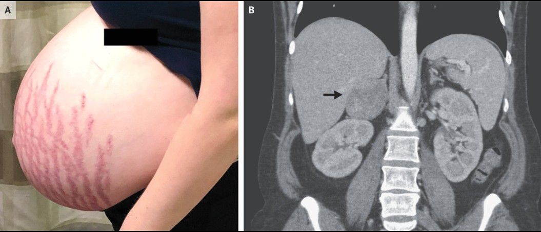 A 27-year-old primigravid woman was admitted to the hospital with new-onset diabetes and hypertension at 32 weeks of gestation. She reported that she had had worsening proximal muscle weakness, striae, and facial plethora for several months. Physical examination showed violaceous striae over the abdomen (Panel A), breasts, and dorsal and supraclavicular fat pads. Laboratory studies were notable for a potassium level of 2.9 mmol per liter (reference range, 3.5 to 5.5) and a urine protein:creatinine ratio of 24 (with protein measured in milligrams and creatinine in millimoles) (reference value, <30). An abdominal ultrasound examination, performed as part of the evaluation for Cushing’s syndrome, revealed a right adrenal mass that was 7 cm in length in its largest dimension. The level of free cortisol in the urine over 24 hours was 3058 nmol (reference value, <160). The patient’s hypertension was managed with labetalol and nifedipine; however, HELLP syndrome (characterized by hemolysis, elevated liver enzymes, and low platelet count) developed at 34 weeks of gestation. A healthy infant weighing 2890 g was delivered. A computed tomographic scan obtained without contrast material showed an adrenal mass measuring 6.8 cm in its largest dimension (Panel B, arrow) with a density of 22 Hounsfield units, a finding suggestive of adrenal carcinoma. Adrenalectomy was performed 1 month after delivery, and histopathological analysis confirmed the presence of high-grade adrenocortical carcinoma. An evaluation showed no evidence of metastatic disease, and treatment with adjuvant mitotane was initiated.