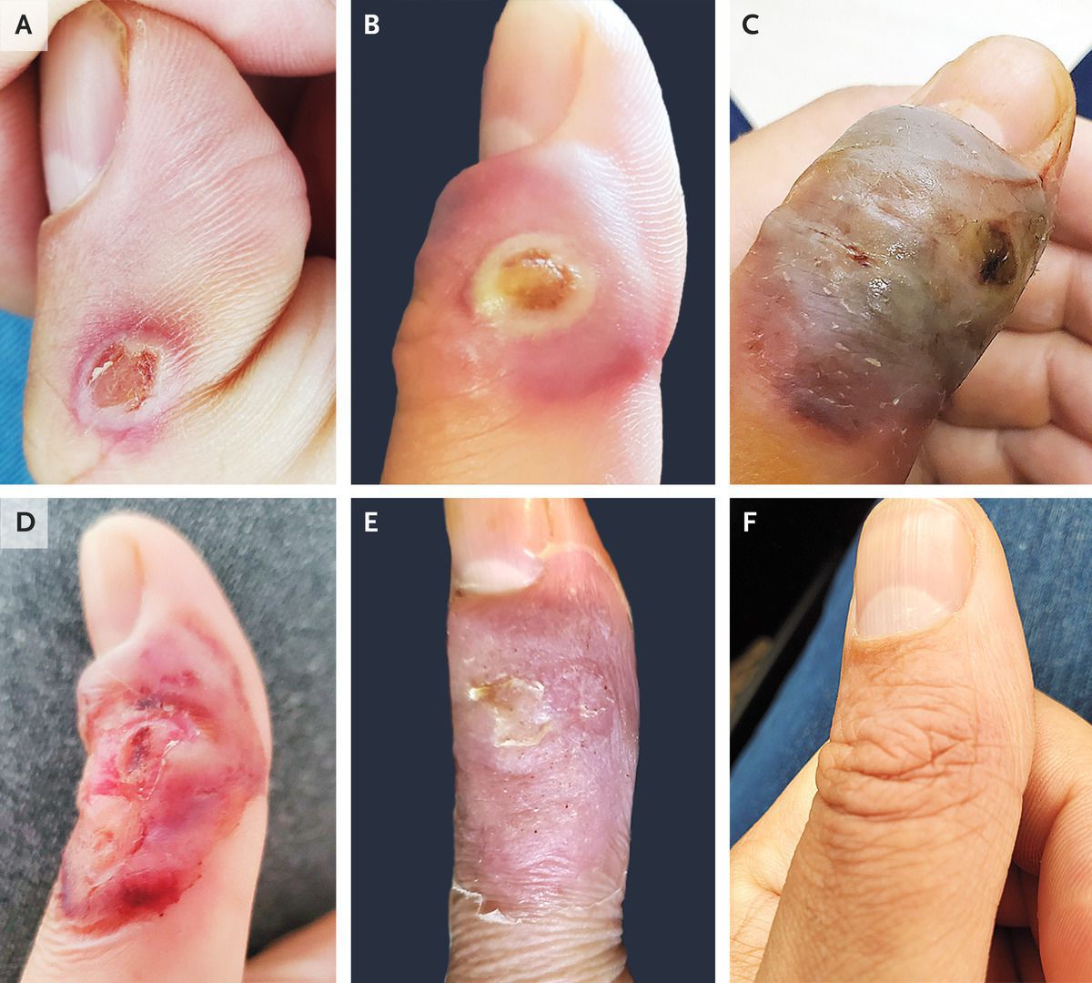 A 45-year-old man presented to the emergency department with an enlarging lesion on the left thumb. The lesion had first manifested as a targetoid papule 2 weeks earlier (Panel A) and had progressively enlarged (Panel B) without associated pain or sensory deficits. He reported that 3 weeks earlier he had had direct contact with sheep and had been handling meat on a farm. Examination showed an edematous and dusky nodule on the dorsal surface of the left thumb (Panel C). The lesion was unroofed; bacterial, mycobacterial, and fungal cultures of samples from the lesion were negative. The clinical history of an evolving nodule and direct contact with sheep was consistent with orf. Orf is the cutaneous infection caused by orf virus, a member of the parapoxvirus genus of poxviruses. Orf virus causes oral infections in sheep and goats and can be transmitted to humans through direct contact. The disease typically progresses from a targetoid papule to a boggy nodule, which subsequently dries out and resolves without treatment aside from simple wound care. In this patient, the unroofed lesion became less edematous (Panel D) and subsequently flattened and dried over the next 3 weeks (Panel E). At follow-up 6 months after onset of the lesion, his thumb had completely healed (Panel F), with only mild residual skin sensitivity.