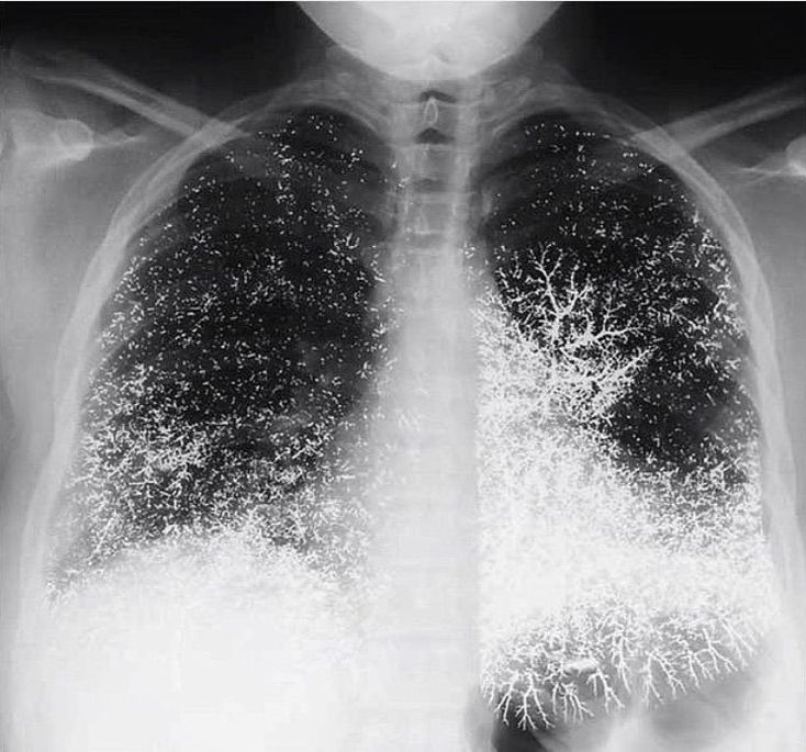 Mercury embolism to the lungs!! A 21-year-old dental assistant attempted suicide by injecting 10 ml (135 g) of elemental mercury intravenously. She presented to the emergency room with tachypnea, a dry cough, and bloody sputum. A chest radiograph showed that the mercury was distributed in the lungs in a vascular pattern that was more pronounced at the bases. The patient was discharged after one week, with improvement in her pulmonary symptoms. Oral chelation therapy with dimercaprol was given for nine months, until the patient stopped the treatment; the urinary mercury level did not change during this period. At follow-up at 10 months, she was healthy, with none of the renal, gastrointestinal, or neurologic effects that can result from the oxidation of mercury in the blood and consequent exposure of these organ systems. The abnormalities on the chest radiograph were still apparent. Although these abnormalities are striking, the absence of clinical toxicity in this patient illustrates the differences in the acute and chronic effects of exposure to elemental mercury, inorganic mercury (e.g., mercuric chloride), and organic mercury (e.g., dimethylmercury). Inorganic and organic mercury are much more toxic than elemental mercury; for example, a dose of 400 mg of mercury in the form of dimethylmercury is usually lethal.