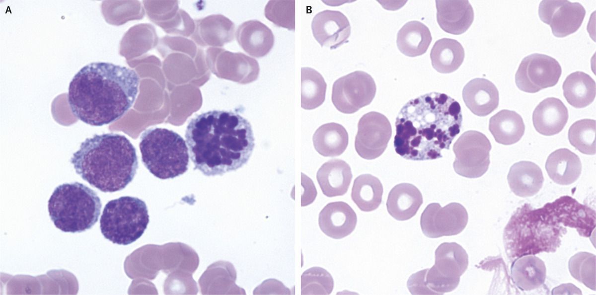 A 31-year-old man with refractory acute myeloid leukemia (AML) presented to the outpatient oncology clinic with worsening pain due to known spinal involvement of the leukemia. He had received the diagnosis of AML 2 years earlier, and the disease had progressed despite treatment that included chemotherapy and allogeneic stem-cell transplantation. He was admitted to the hospital to receive analgesic agents and further treatment. Seven weeks later, laboratory studies showed progressive, marked leukocytosis, with a white-cell count of 91,100 per cubic millimeter (reference range, 3900 to 10,200), and 87% of the leukocytes were myeloid blasts. A peripheral-blood smear showed multiple mitotic figures (Panel A) as well as apoptotic figures (Panel B) — rare findings that are suggestive of the highly proliferative nature of the refractory AML in this patient. The decision was made to focus on palliative care, and the patient died 4 days later.