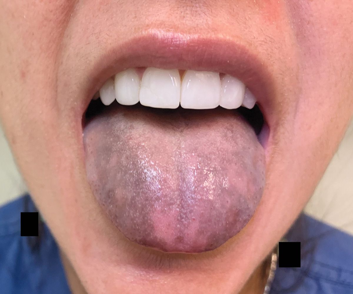 A 33-year-old woman with celiac disease presented to the dermatology clinic with a 3-week history of painless discoloration of the tongue. She reported that she had not used tobacco or bismuth compounds or consumed colored foods or candies, and she had no amalgam fillings. A progesterone-releasing intrauterine device had been placed in the patient 3 years earlier for contraception, and she had been taking no other medications. She reported mild fatigue but otherwise felt well. Physical examination revealed hyperpigmented reticular patches on the dorsolateral aspects of her tongue, with sparing of the buccal mucosa, palate, gingiva, and other mucosa. Laboratory studies were notable for a normal complete blood count, a normal comprehensive metabolic panel, and normal vitamin B12 and thyrotropin levels. A cosyntropin stimulation test showed an insufficient adrenal response, with a baseline cortisol level of 7.9 μg per deciliter (218 nmol per liter), a 30-minute cortisol level of 9.5 μg per deciliter (262 nmol per liter), and a 60-minute cortisol level of 7.5 μg per deciliter (207 nmol per liter); the corticotropin level, measured in the afternoon, was elevated at 1102 pg per milliliter (243 pmol per liter) (reference value, <20 pg per milliliter [<4 pmol per liter]). A 21-hydroxylase antibody test was positive, a finding consistent with a diagnosis of autoimmune adrenal insufficiency. In primary adrenal insufficiency, skin hyperpigmentation is often generalized and involves sun-exposed areas, the palmar creases, nail beds, and mucous membranes; isolated tongue discoloration is less common. Daily treatment with oral hydrocortisone was initiated, and she was counseled regarding the symptoms of adrenal crisis and the need for lifelong therapy. Within 4 to 8 weeks after the initiation of treatment, the tongue hyperpigmentation had resolved.