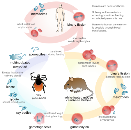 Babesiosis is caused by microscopic parasites that infect red blood cells and are spread by certain ticks. In the United States, tickborne transmission is most common in particular regions and seasons: it mainly occurs in parts of the Northeast and upper Midwest and usually peaks during the warm months.
