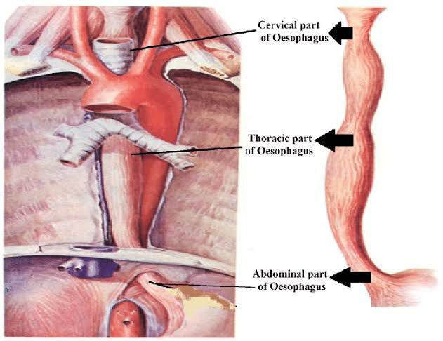The esophagus (oesophagus) is a 25 cm long fibromuscular tube extending from the pharynx (C6 level) to the stomach (T11 level). It consists of muscles that run both longitudinally and circularly, entering into the abdominal cavity via the right crus of the diaphragm at the level of the tenth thoracic vertebrae. It actively facilitates the passage of the food bolus into the stomach under precise nervous regulation. Therefore, it is part of the digestive system.The esophagus is divided into three parts: Cervical which travels through the neck Thoracic which is located in the thorax, more specifically in the mediastinum Abdominal which travels past the diaphragm into the abdomen, reaching the stomach The esophagus ends up being constricted in multiple points along its length. These include: a cervical constriction, at the origin of the esophagus due to the cricoid cartilage, thoracic constrictions, where it is crossed anteriorly by the aortic arch and the left primary bronchus, and a diaphragmatic constriction, where it passes through the esophageal hiatus. Innervation: Esophageal nervous plexus Blood supply: Esophageal branches of the thoracic aorta, azygos, hemiazygos, accessory hemiazygos veins Lymphatics: Inferior deep cervical, posterior mediastinal, intercostal, paratracheal, superior and inferior tracheobronchial lymph nodes Histology Mucosa: nonkeratinized stratified squamous epithelium, lamina propria, smooth muscle layers Submucosa: esophageal glands and papillae Muscularis externa: striated muscle on the upper third, smooth and striated muscles in the middle third, smooth muscle in the lower third Adventitia: fibroareolar adventitia