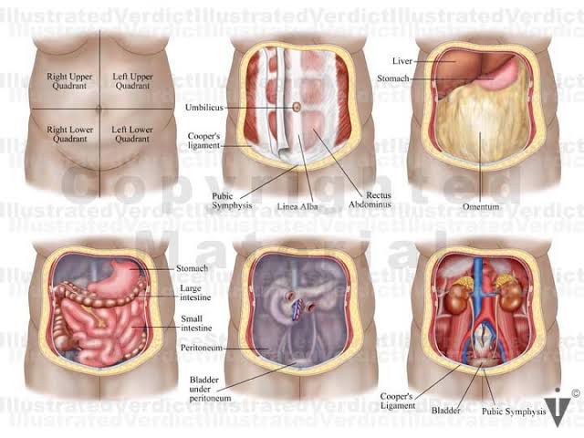 The definition of the human abdomen is the anterior region of the trunk between the thoracic diaphragm superiorly and the pelvic brim inferiorly. The anterior wall of the abdomen has nine layers. From outermost to innermost, they are skin, subcutaneous tissue, superficial fascia, external obliques, internal obliques, transversus abdominis, transversalis fascia, preperitoneal adipose and areolar tissue, and the peritoneum. The peritoneum is one continuous membrane; however, it is classified as either visceral (lining the organs) or parietal (lining the cavity wall). A peritoneal cavity is therefore formed and filled with extracellular fluid used to lubricate the surfaces to reduce friction. The peritoneum is composed of a layer of simple squamous epithelial cells. The subcutaneous tissue of the anterior abdominal wall below the umbilicus also separates into two distinct layers: the superficial fatty layer known as Camper's fascia, and the deeper membranous layer known as Scarpa's fascia. This membranous layer is continuous with Colles fascia within the perineal region inferiorly. The true abdominal cavity consists of the stomach, duodenum (first part), jejunum, ileum, liver, gallbladder, the tail of the pancreas, spleen, and the transverse colon. The posterior wall of the abdominal cavity is known as the retroperitoneum.The retroperitoneal structures include the suprarenal glands, aorta and inferior vena cava, duodenum (parts 2 to 4), pancreas (head and body), ureters, colon (descending and ascending), kidneys, esophagus (thoracic), and rectum.One can use the mnemonic SAD PUCKER.