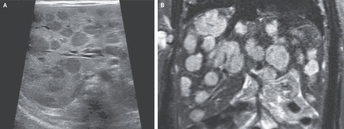A 16-day-old girl who had not yet returned to her birth weight was brought to the emergency department with lethargy. She had tachypnea and marked hepatomegaly with a hepatic bruit, as well as eight small hemangiomas on the scalp, thorax, abdomen, and limbs that had been noted within days after birth. Abdominal ultrasonography showed numerous rounded hypoechoic lesions in the liver (Panel A). Whole-body magnetic resonance imaging showed contrast-enhancing hepatic lesions, as large as 20 mm in diameter, that were hyperintense on T2-weighted images (Panel B), a finding consistent with infantile hepatic hemangiomas. Moderate cardiomegaly was also noted. Laboratory studies showed a thyrotropin level of 25.5 mIU per liter (reference range, 0.50 to 8.50) and a reverse triiodothyronine level of greater than 3696 pmol per liter (reference range, 140 to 540). Complications of infantile hepatic hemangiomas include high-output cardiac failure, consumptive hypothyroidism, and bleeding. These vascular lesions typically have rapid growth followed by a phase of slow involution, sometimes over a period of years. Treatment with propranolol, furosemide, and high-dose levothyroxine was initiated. The liver lesions gradually reduced in size, and after 9 months, treatment was stopped successfully.