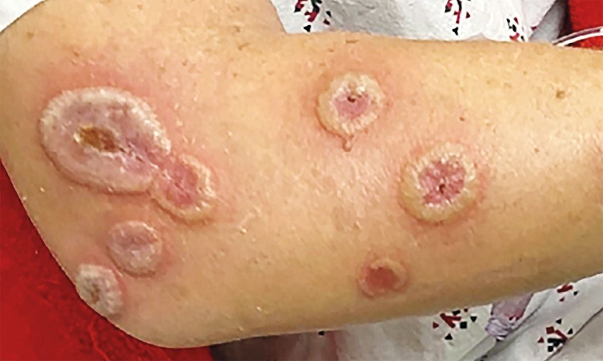 A 46-year-old woman presented to the emergency department with an erythematous lesion on her left thumb that had developed over the course of 2 days. She received a diagnosis of acute paronychia and was treated with oral clindamycin. By day 7 of treatment, the initial lesion had increased in size, and multiple painful, circular, raised lesions with central erosion and crusting had developed on her face, feet, hands, and arms. She reported no recent viral or other infections and had neither current nor previous gastrointestinal symptoms suggestive of inflammatory bowel disease. Laboratory studies showed a leukocyte count of 11,700 per cubic millimeter (reference range, 4100 to 10,700) and a normal glycated hemoglobin level. Tests for antinuclear antibodies, antineutrophil cytoplasmic antibodies, human immunodeficiency virus antibodies, and syphilis were all negative, as was evaluation for viral hepatitis. A biopsy specimen of one of the lesions showed a neutrophilic inflammatory infiltrate that was consistent with acute febrile neutrophilic dermatosis, also known as Sweet’s syndrome. This inflammatory condition can mimic an infectious process and is important to consider, especially in cases in which cutaneous lesions do not abate with antibiotic treatment. Oral prednisone was initiated, and the pain, as well as the discoloration and size of the lesions, decreased within 48 hours. At a 1-month follow-up visit, the inflammation had resolved, with some mild residual skin discoloration.
