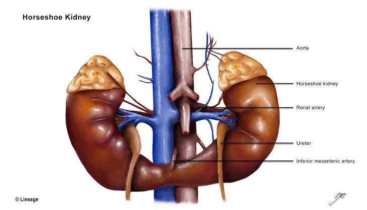 The congenital malformation of the renal system results in fused kidneys.Twice as common in males.The fusion of the lower poles of the kidneys results trapping of the fused kidneys under the inferior mesenteric artery. It is the arrest of the normal retroperitoneal ascent of the kidneys. Associated with Turner syndrome, trisomy 18 (Edwards syndrome). Most commonly asymptomatic, other symptoms include increased rate of urinary tract infections, hydronephrosis due to ureteropelvic junction obstruction, renal stones On the physical exam there is abdominal fullness upon palpation.