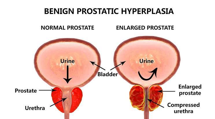 Benign prostatic hyperplasia—also called BPH—is a condition in men in which the prostate gland is enlarged and not cancerous. Benign prostatic hyperplasia is also called benign prostatic hypertrophy or benign prostatic obstruction.occurs mainly in older men. Men with the following factors are more likely to develop benign prostatic hyperplasia: -Age 40 years and older -Family history of benign prostatic hyperplasia medical conditions such as obesity, heart and circulatory disease, and type 2 diabetes -Lack of physical exercise -Erectile dysfunctional Lower urinary tract symptoms suggestive of benign prostatic hyperplasia may include urinary frequency—urination eight or more times a day urinary urgency—the inability to delay urination trouble starting a urine stream a weak or an interrupted urine stream dribbling at the end of urination nocturia—frequent urination during periods of sleep urinary retention urinary incontinence—the accidental loss of urine pain after ejaculation or during urination urine that has an unusual color or smell.Treatment options for benign prostatic hyperplasia may include lifestyle changes medications (alpha blockers, phosphodiesterase-5 inhibitors, 5-alpha reductase inhibitors, combination medications) minimally invasive procedures ( transurethral needle ablation, transurethral microwave thermotherapy, high-intensity focused ultrasound, transurethral electro-vaporization, water-induced thermotherapy, prostatic stent insertion) surgery