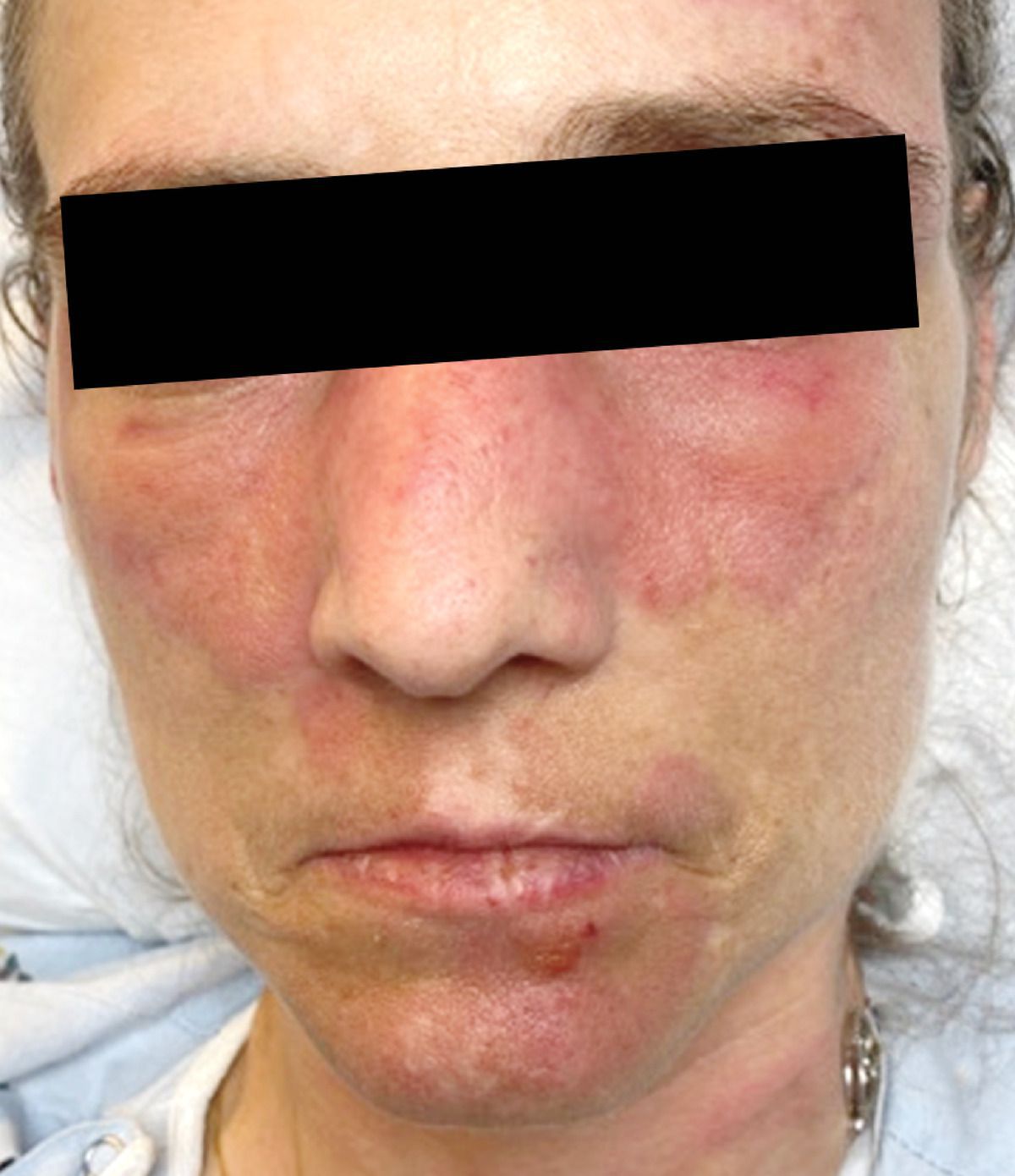 A 42-year-old woman was admitted to the hospital for induction chemotherapy with cytarabine, daunorubicin, and midostaurin for treatment of newly diagnosed acute monocytic leukemia with a tyrosine kinase domain mutation in FLT3. On day 10 of hospitalization, a rash developed that was characterized by prominent edematous, erythematous plaques on the cheeks, forehead, neck, ear, and right hand. Laboratory studies obtained at the time the rash developed showed a white-cell count of 200 per cubic millimeter (reference range, 3700 to 11,000). A bacterial infection was suspected, and treatment with vancomycin was initiated. However, the rash progressed. A punch biopsy was performed and showed a focal, perieccrine, neutrophilic inflammatory infiltrate with necrosis of the eccrine ducts. A diagnosis of neutrophilic eccrine hidradenitis was made. Neutrophilic eccrine hidradenitis has been associated with chemotherapy agents, particularly cytarabine plus an anthracycline, used in the treatment of acute myelogenous leukemia. Treatment with systemic glucocorticoids was initiated, and over the following week the rash resolved, with superficial desquamation.
