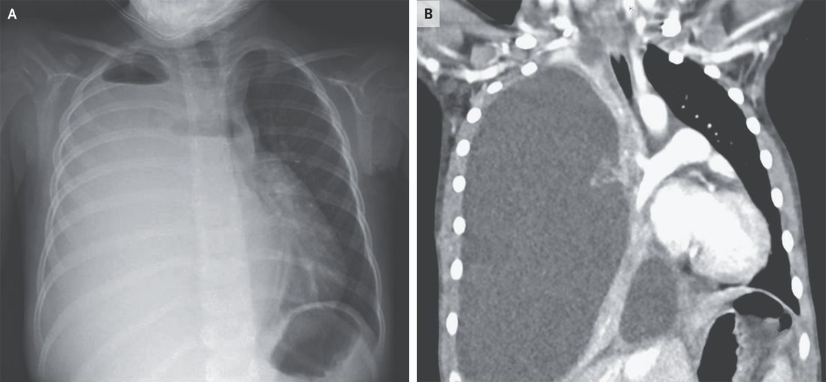 A 4-year-old girl was brought to the emergency department with a 4-day history of fever, cough, and lethargy. She was up to date with all childhood vaccinations. Three weeks earlier, she had had a presumed viral respiratory tract infection with fever and cough; testing for severe acute respiratory syndrome coronavirus 2 had been negative at that time. On arrival during the current presentation, she had a heart rate of 136 beats per minute, a respiratory rate of 32 breaths per minute, and an oxygen saturation of 92% while she was breathing ambient air. Auscultation of the lungs was notable for the absence of breath sounds on the right side and diminished breath sounds on the left. Laboratory studies showed a leukocyte count of 25,300 per cubic millimeter (reference range, 5000 to 15,500) with 88% neutrophils. Chest radiography revealed opacification of the right hemithorax with apical air–fluid levels, indicating the presence of a hydropneumothorax (Panel A). Findings on computed tomography of the chest included right lung collapse due to massive effusion and leftward mediastinal shift (Panel B). The left lung parenchyma appeared normal, without abscesses or cysts. The patient underwent chest-tube placement, and 1 liter of cloudy fluid was evacuated. Pleural fluid cultures grew Streptococcus pneumoniae. Pneumococcus remains an important cause of postviral pneumonia and empyema, even in fully vaccinated children. The patient received 14 days of treatment with ceftriaxone. At a 3-month follow-up visit, she had recovered fully, and a repeat chest radiograph was normal.