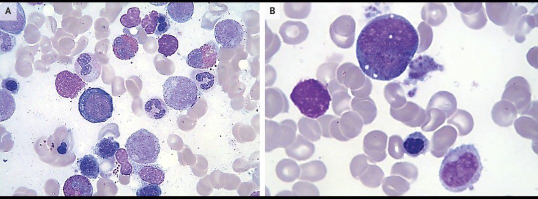 A 73-year-old woman was referred to the hematology clinic for evaluation of anemia that had been detected by her primary care physician during an evaluation for fatigue. Her medical history included alcohol use disorder. The patient reported no blood in her stool or urine. Laboratory studies showed a hemoglobin level of 8.5 g per deciliter (reference range, 11.5 to 15.5), with a mean corpuscular volume of 96.3 fl (reference range, 80 to 100) and normal platelet and white-cell counts. Liver-function tests and serum iron, folate, and vitamin B12 levels were normal. Bone marrow biopsy was performed, which revealed trilineage hematopoietic maturation with severe dyserythropoiesis, including enlarged immature nuclei and nuclear irregularity (Panel A), vacuoles in erythroid precursors (not shown), and immature myeloid cells (Panel B). The karyotype was normal. Although this appearance of the bone marrow was possibly consistent with myelodysplastic syndrome, these findings may also be seen in copper deficiency. The copper level in this patient was 40 μg per deciliter (6.3 μmol per liter; reference range, 85 to 155 μg per deciliter [13.4 to 24.4 μmol per liter]). Oral copper supplementation was initiated. At follow-up 3 months after presentation, the patient’s fatigue had abated and the anemia had resolved.