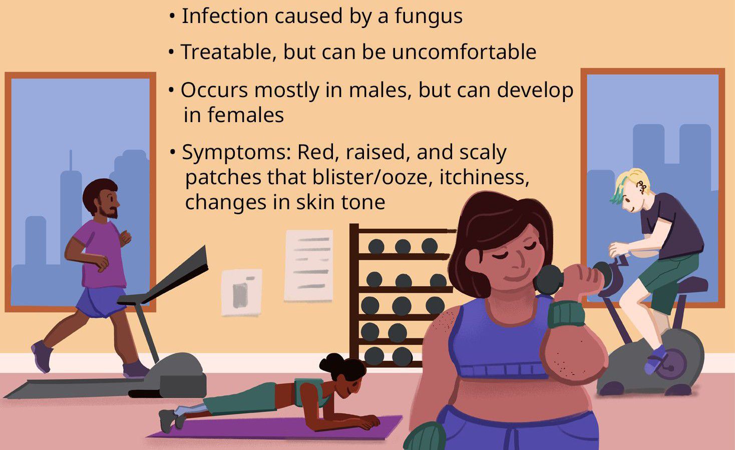 Jock itch can be triggered by friction from clothes and prolonged moistness in the groin area, such as from sweating. A fungal infection of the feet can spread to the groin area by pulling up pants if the waistband gets contaminated with fungus from the feet.