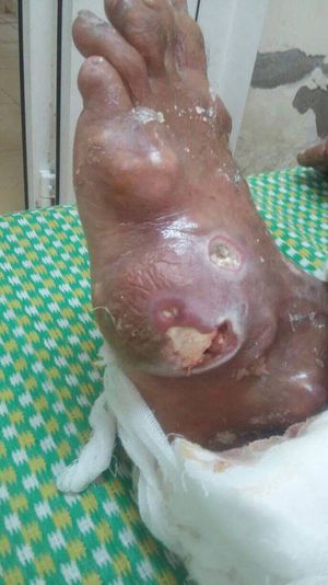 A 86 years old man , significant medical history include gout 20 years, chronic kidney failure complainting with painful and discharge from his foot make him wake up at night. He self-treatment by traditional drug , sometime he injects novocain and penicillin to relieve pain :( which do you shoud for next step ?