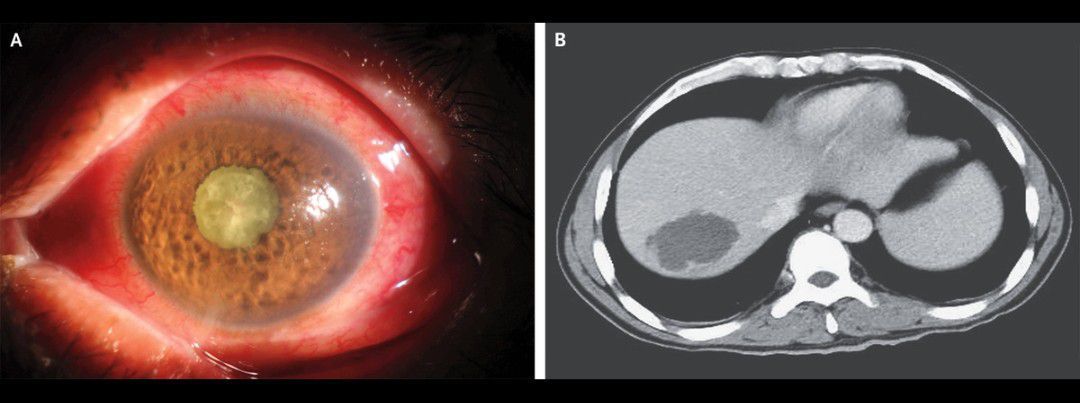 A 45-year-old man with type 2 diabetes mellitus presented to the ophthalmology clinic with a 5-day history of pain and decreased vision in his left eye. His temperature was 39.2°C, and his pulse was 144 beats per minute. Examination of the left eye showed diffuse conjunctival injection, a dense cataract, and no light perception (Panel A). Owing to concern for endogenous endophthalmitis with systemic infection, the patient was referred to the emergency department. Contrast-enhanced computed tomography of the chest, abdomen, and pelvis was performed and showed abscesses in the lungs, liver (Panel B), kidneys, and prostate. The patient received intravenous and intravitreal antibiotic agents and underwent percutaneous drainage of the abscesses in the liver and prostate. Cultures of blood, pus from the abscesses in the liver and prostate, and vitreous fluid grew Klebsiella pneumoniae, and the hypervirulent K1 serotype was identified on a polymerase-chain-reaction assay. Hypervirulent K. pneumoniae can cause pyogenic abscesses in a range of sites, including the liver, central nervous system, lungs, urinary tract, and soft tissues. The patient declined vitrectomy during hospitalization. At a follow-up visit 2 months after presentation, he had recovered well but had complete loss of vision in his left eye.