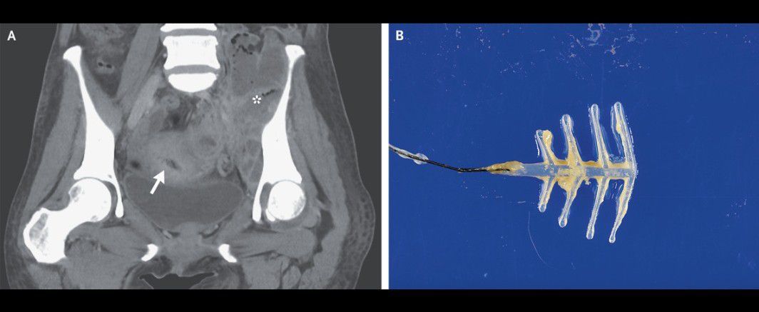 A 54-year-old woman presented to the emergency department with a 2-month history of fevers and weight loss and a 3-week history of abdominal pain and difficulty walking. Her temperature was 38.5°C. Examination was notable for a tender mass in the left lower quadrant of the abdomen. Laboratory studies showed a white-cell count of 30,420 per cubic millimeter (reference range, 3300 to 8600). Contrast-enhanced computed tomography (CT) revealed an intrauterine device (IUD) (Panel A, arrow) surrounded by multiple abscesses (asterisk) throughout the abdomen and pelvis that extended into the left iliopsoas muscle and left hip joint. The patient underwent CT-guided drainage of the abscesses, washout of the left hip joint, and removal of the IUD, which was coated in sulfur-colored granules (Panel B). Gram’s staining of fluid samples revealed branching, filamentous, gram-positive rods. Actinomyces israelii was grown on culture. The patient reported that the IUD had been inserted more than two decades before presentation and had not been replaced since that time. After a prolonged course of intravenous antibiotics followed by oral antibiotics, the patient’s abdominal and hip pain abated.