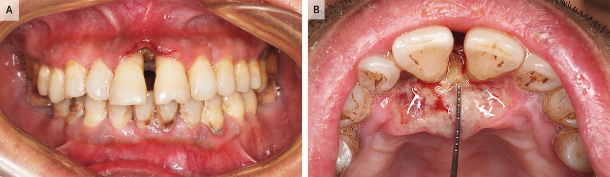 A 50-year-old man with a history of alcohol and tobacco use presented to the dental clinic with a 1-month history of fever, nasal congestion, and an enlarging ulcer between his front teeth. Oral examination showed gingival recession, yellowing of the teeth, alveolar bone exposure, and a gap between his top two front teeth with gingival ulceration (Panel A). The ulcer had an irregular border and extended onto his hard palate (Panel B). A complete blood count was notable for lymphopenia (1000 lymphocytes per cubic millimeter; reference range, 1100 to 3200). A biopsy specimen of the ulcer was obtained. Histopathological examination confirmed the diagnosis of extranodal natural killer T-cell lymphoma (nasal type), and Epstein–Barr virus was detected on in situ hybridization. After the patient was referred to the oncology department, a positron-emission tomographic (PET) scan showed involvement of the maxillary sinuses, nasopharynx, cervical lymph nodes, upper right lung, and spleen. The patient underwent treatment with asparaginase-based chemotherapy, after which a surveillance PET scan showed disease progression. Palliative radiation therapy was recommended.