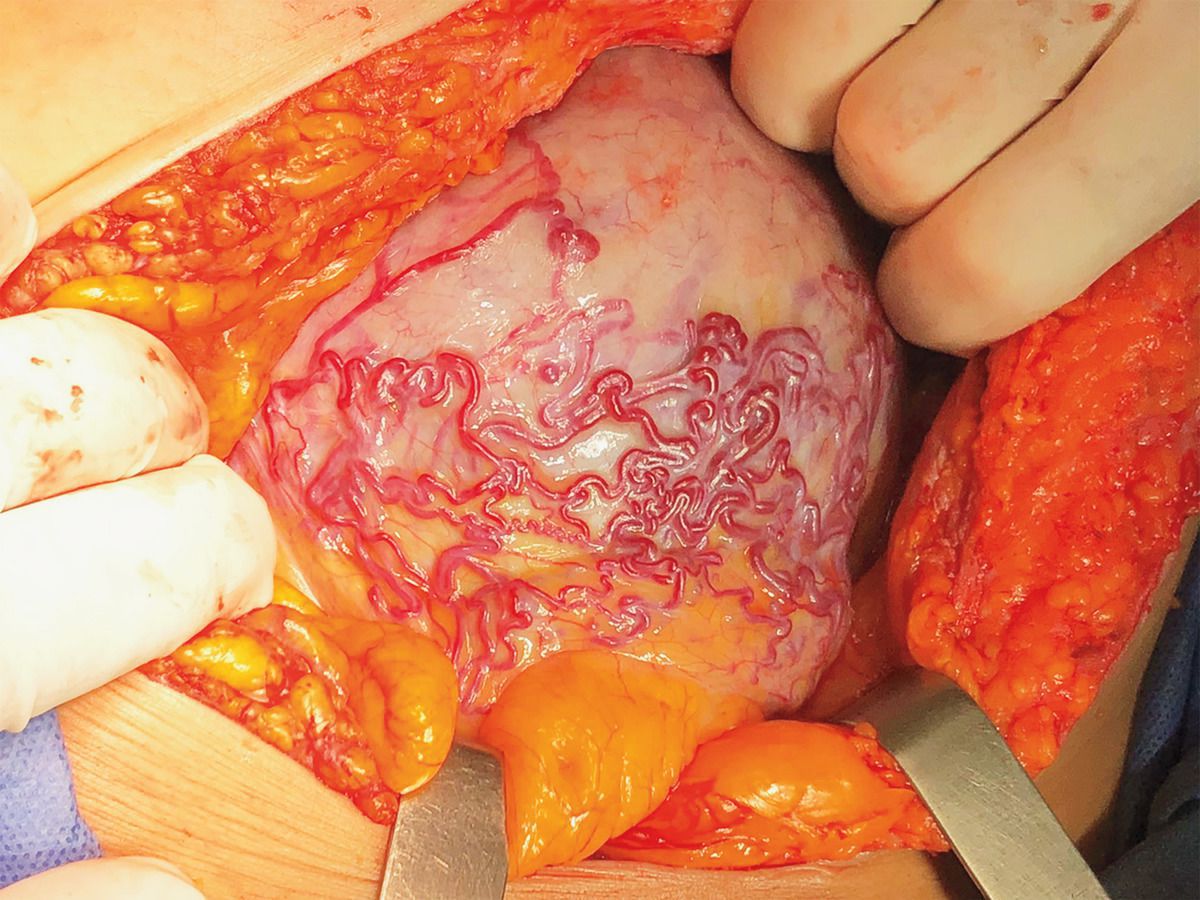 A 26-year-old woman at 32 weeks of gestation presented to the emergency department with painful uterine contractions. This pregnancy was the patient’s third; she had a history of two cesarean deliveries. Cervical examination showed dilation to 3 cm with 40% effacement. Cesarean section was performed owing to the high risk of uterine rupture. During the procedure, multiple placental vessels were visualized on the lower outer uterine walls. The surgery was converted to a cesarean hysterectomy with the delivery of a healthy infant. The surgery was complicated by postpartum hemorrhage of 4000 ml, for which the patient underwent transfusion according to an institutional protocol for massive transfusion. No bladder injury occurred. Placenta increta was identified on histopathological examination. Disorders of abnormal placental adherence to the uterine myometrium, also known as placenta accreta spectrum, are associated with prior cesarean delivery and may remain undiagnosed until the time of delivery, as in this case. Identification is paramount to avoid major complications, such as postpartum hemorrhage. After observation in the intensive care unit, the patient was discharged home with her infant on postpartum day 5.