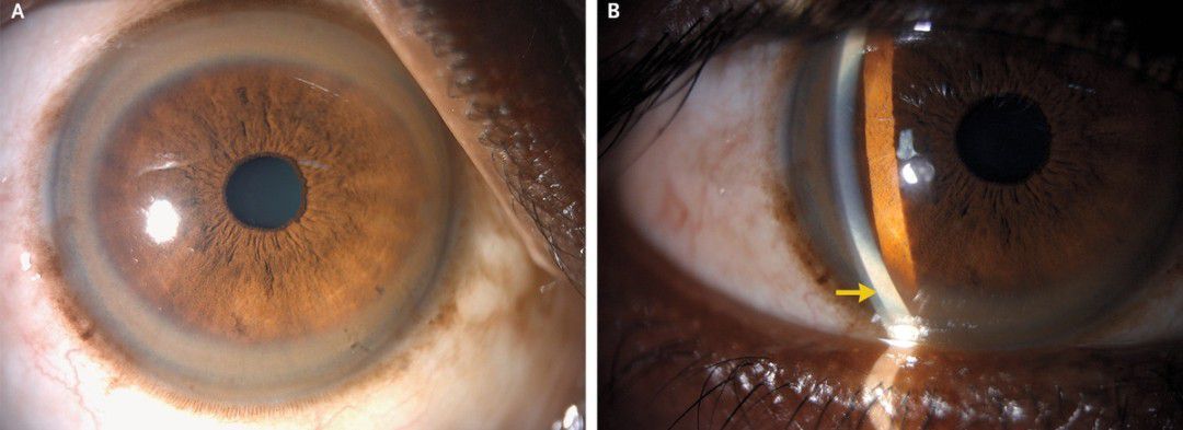 A 47-year-old man with no known medical history presented to the department of internal medicine with a 2-month history of abdominal distention and melena. He did not drink alcohol or take any medications or supplements. Physical examination was notable for ascites, pedal edema, gynecomastia, postural tremor, and mild cognitive impairment. During the physical examination, pigmented rings were observed in both corneas (Panel A), and copper deposition was observed in Descemet’s membrane on slit-lamp examination (Panel B, arrow). Both findings were consistent with Kayser–Fleischer rings. Laboratory studies showed mild elevations in serum levels of aminotransferases and total bilirubin, a prolonged international normalized ratio, and a normal alkaline phosphatase level. The serum ceruloplasmin level was 3.1 mg per deciliter (reference range, 14 to 40), the serum copper level was 5 μmol per liter (reference range, 10 to 22), and the 24-hour urinary copper excretion was 382 μg (reference range, 10 to 30). Genetic testing revealed a compound heterozygous mutation in ATP7B, the gene encoding a copper-transporting ATPase, and a diagnosis of cirrhosis due to Wilson’s disease was made. Treatment with trientine and zinc for copper chelation was started, and the patient was listed for liver transplantation.