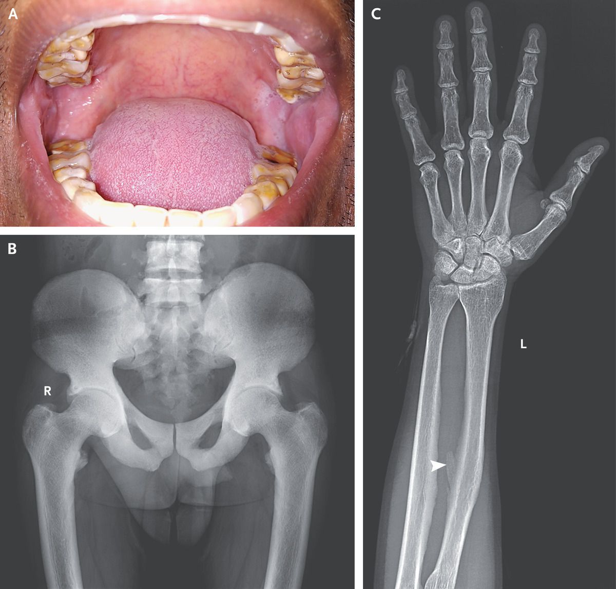 A 32-year-old man presented to the rheumatology clinic with a several-year history of lower back pain and stiffness of the neck, shoulders, and hips. On examination, he had yellowish-brown tooth discoloration (Panel A) and restricted movements of the cervical spine, hips, and shoulders. Pelvic radiography showed osteosclerosis without sacroiliitis (Panel B). T scores for bone mineral density were +12.1 at the lumbar spine and +3.1 at the hip. Laboratory tests showed an alkaline phosphatase level of 479 IU per liter (reference range, 80 to 240) and a parathyroid hormone level of 103 pg per milliliter (reference range, 15 to 68), with normal levels of creatinine, calcium, and vitamin D. Since the patient lived in an area with high levels of fluoride in the groundwater, skeletal fluorosis was suspected. Radiography of both forearms showed interosseous membrane calcification (Panel C, arrowhead). The serum fluoride level was 0.05 ppm (reference value, <0.02 ppm), and the 24-hour urinary fluoride excretion was 7.5 ppm (reference value, <0.1 ppm), which confirmed the diagnosis. He was advised to defluorinate his drinking water and was treated with calcium, vitamin D, and nonsteroidal antiinflammatory drugs. Two years later, he reported a 50% reduction in pain and stiffness.