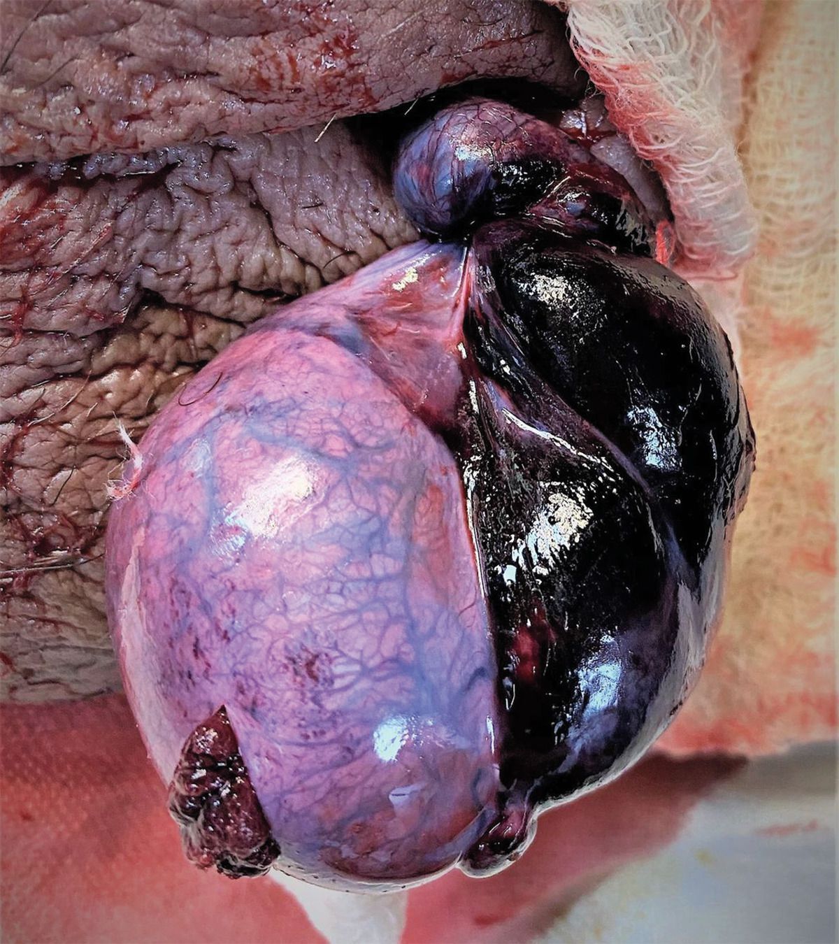A 16-year-old boy with no clinically significant medical history presented to the emergency department with a 2-day history of left testicular pain, nausea, and vomiting. He lived in a remote area of India and said that the pain had developed suddenly while he was taking a bath. On physical examination, the left side of the scrotum was erythematous. The left testicle was tender on palpation and elevated as compared with the right testicle, and the cremasteric reflex on the left side was absent. The patient was taken to the operating room for emergency scrotal exploration. On gross examination, the left testicle was black, with 1080 degrees of spermatic cord rotation. There was no bell clapper deformity (an abnormal attachment of the tunica vaginalis that enables increased testicular mobility). Despite detorsion of the testis, there was no improvement in its color during 15 minutes of observation. An incision made in the tunica albuginea yielded no blood. Left orchiectomy and right orchiopexy were performed. The patient’s pain and swelling subsided postoperatively, and he was discharged 2 days later.