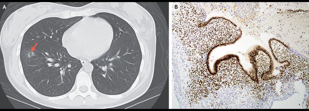 A 26-year-old woman presented to the emergency department with an episode of coughing up blood. During the previous 4 years, she had had intermittent episodes of small-volume hemoptysis coinciding with her menstrual cycles. She had no other abdominal or pelvic symptoms. Her oxygen saturation was 100% while she was breathing ambient air. On physical examination, the lungs were clear. Noncontrast computed tomography (CT) of the chest on the third day of her menstrual cycle showed an 11-mm ground-glass, cavitary nodule in the right lower lobe (Panel A, arrow). A video-assisted thoracoscopic wedge resection was performed, and a reddish-brown lesion was identified. Histopathological analysis revealed endometrial glands and stroma (Panel B), which confirmed a diagnosis of thoracic endometriosis. Catamenial hemoptysis is a rare manifestation of thoracic endometriosis, and both CT and histopathological examination are important for diagnosis. At a follow-up visit 2 years after resection, the patient was symptom-free.