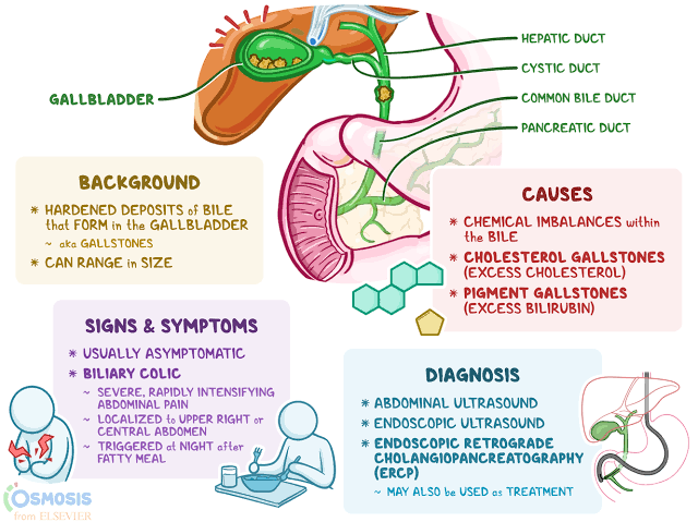 Gallstones are hardened collections of bile materials that develop in your gallbladder. They can be as small as a grain of sand or as big as a ping pong ball. Most don’t cause any problems, but they can cause problems if they get loose and travel into your bile ducts. The condition of having gallstones is called cholelithiasis.