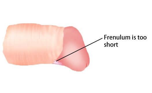 The most common signs and symptoms of frenulum breve are: Discomfort or pain in the penis, especially during an erection. Premature ejaculation. Tearing and bleeding underneath the head of the penis. Trouble pulling back the foreskin.