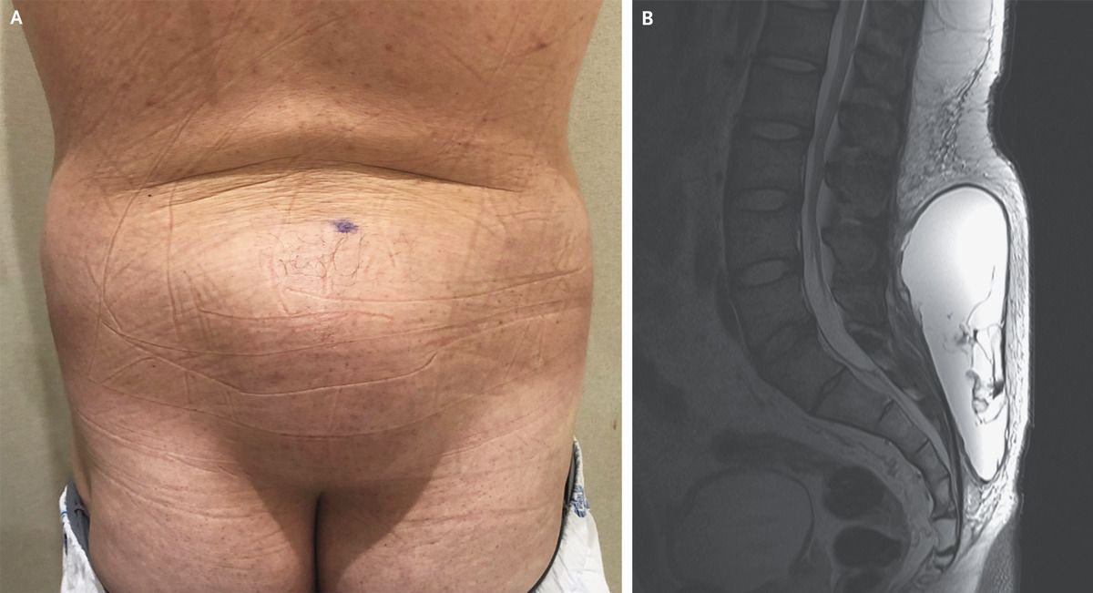 A healthy 36-year-old man presented to the orthopedic clinic with an enlarging lower back mass. He had first noticed the mass 3 weeks earlier, after he slipped on the stairs and slid down on his back. On physical examination, a large, soft, fluctuant mass with no overlying skin necrosis was palpated on the lower back (Panel A). Magnetic resonance imaging of the lumbosacral spine showed an encapsulated, subcutaneous, suprafascial lesion, measuring 20 cm by 20 cm by 10 cm, that extended from the lower lumbar area to the buttocks (Panel B), a finding consistent with a Morel–Lavallée lesion. A Morel–Lavallée lesion is a traumatic, closed degloving injury that results from shearing of subcutaneous tissue away from the underlying fascia. Its management varies; in this case, surgical excision was performed because of the risk of recurrence, given its encapsulation and chronicity. Histologic examination of the excised cystic mass showed a pseudocyst lined with myofibroblasts. Three months after the surgery, the patient had recovered fully without recurrence of the mass.
