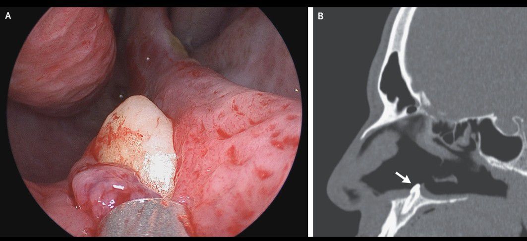 A 38-year-old man presented to the otolaryngology clinic with difficulty in breathing through his right nostril, which he said had been ongoing for several years. He reported no history of facial trauma or craniofacial abnormalities. Physical examination of the nose showed a septal deviation, calcified septal spurs, and a 2-cm perforation in the posterior septum. On rhinoscopy, a hard, nontender, white mass was observed in the floor of the right nostril (Panel A). Computed tomography of the paranasal sinuses showed a well-defined, radiodense mass consistent with an inverted ectopic tooth in the nasal cavity (Panel B, arrow), which was thought to explain the obstructive symptoms and septal perforation. The tooth was removed during oral and otolaryngologic surgery by means of an intranasal approach and measured 14 mm in length. There were no postoperative complications. At follow-up 3 months after surgery, the patient’s symptoms of nasal obstruction had resolved.