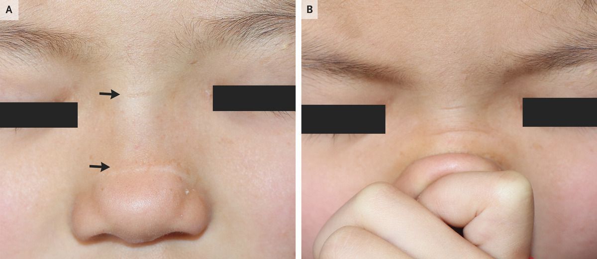 A 6-year-old girl with a history of eczema presented to the dermatology clinic with horizontal lines across her nose that had developed during the preceding 2 weeks. She also reported perennial sneezing, nasal congestion and itching, and rhinorrhea, which worsened in the spring and fall. On physical examination, two transverse lines crossing the bridge of her nose were noted (Panel A, arrows), and the patient was seen upwardly rubbing her nose (Panel B), a motion known as the “allergic salute.” A clinical diagnosis of allergic rhinitis was made. Transverse nasal creases due to frequent upward pushing of the nose are a sign of allergic rhinitis, especially in children and in patients with atopic conditions. After 2 weeks of treatment with nasal glucocorticoids and oral antihistamines, the patient reported relief from her symptoms. At follow-up 3 months later, the skin changes had resolved.