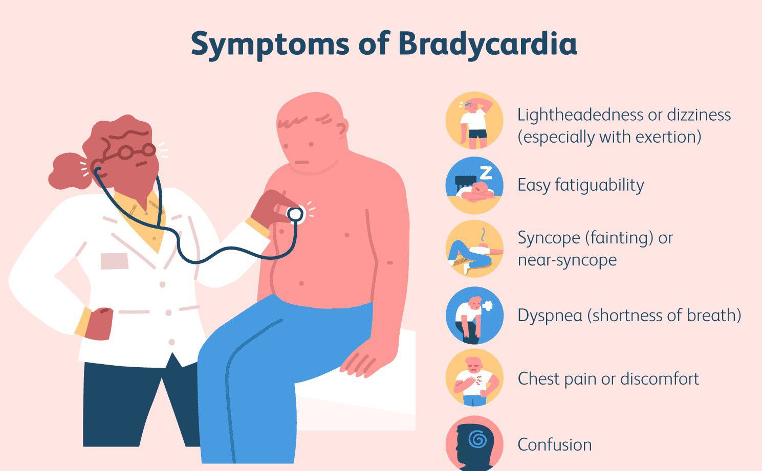 Lightheadedness or dizziness. Fainting. Fatigue. Dizziness. Shortness of breath. Reduced exercise tolerance. Worsened chest pain (if already present) Worsened heart failure (if already present)