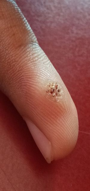 Patient having from 2 months , blood will appear if pricked those black structures coming out.. Doesn't Contain fluid , no pain