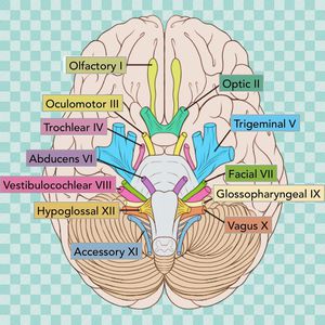 Cranial nerves are the nerves that emerge directly from the brain (including the brainstem), in contrast to spinal nerves (which emerge from segments of the spinal cord). Cranial nerves are generally named according to their structure or function. Smell (I) The olfactory nerve (I) conveys the sense of smell. Vision (II) The optic nerve (II) transmits visual information. Eye movement (III, IV, VI) The oculomotor nerve (III), trochlear nerve (IV) and abducens nerve (VI) coordinate eye movement. Trigeminal nerve (V) The trigeminal nerve (V) comprises three distinct parts: The Ophthalmic (V1), the Maxillary (V2), and the Mandibular (V3) nerves. Combined, these nerves provide sensation to the skin of the face and also controls the muscles of mastication (chewing). Facial expression (VII) Lesions of the facial nerve (VII) may manifest as facial palsy. This is where a person is unable to move the muscles on one or both sides of their face. A very common and generally temporary facial palsy is known as Bell's palsy. Hearing and balance (VIII) The vestibulocochlear nerve (VIII) splits into the vestibular and cochlear nerve. The vestibular part is responsible for innervating the vestibules and semicircular canal of the inner ear; this structure transmits information about balance, and is an important component of the vestibuloocular reflex, which keeps the head stable and allows the eyes to track moving objects. Oral sensation, taste, and salivation (IX) The glossopharyngeal nerve (IX) innervates the stylopharyngeus muscle and provides sensory innervation to the oropharynx and back of the tongue. Vagus nerve (X) Loss of function of the vagus nerve (X) will lead to a loss of parasympathetic innervation to a very large number of structures. Shoulder elevation and head-turning (XI) Damage to the accessory nerve (XI) will lead to ipsilateral weakness in the trapezius muscle. Tongue movement (XII) The hypoglossal nerve (XII) is unique in that it is innervated from both the motor cortex of both hemispheres of the brain.