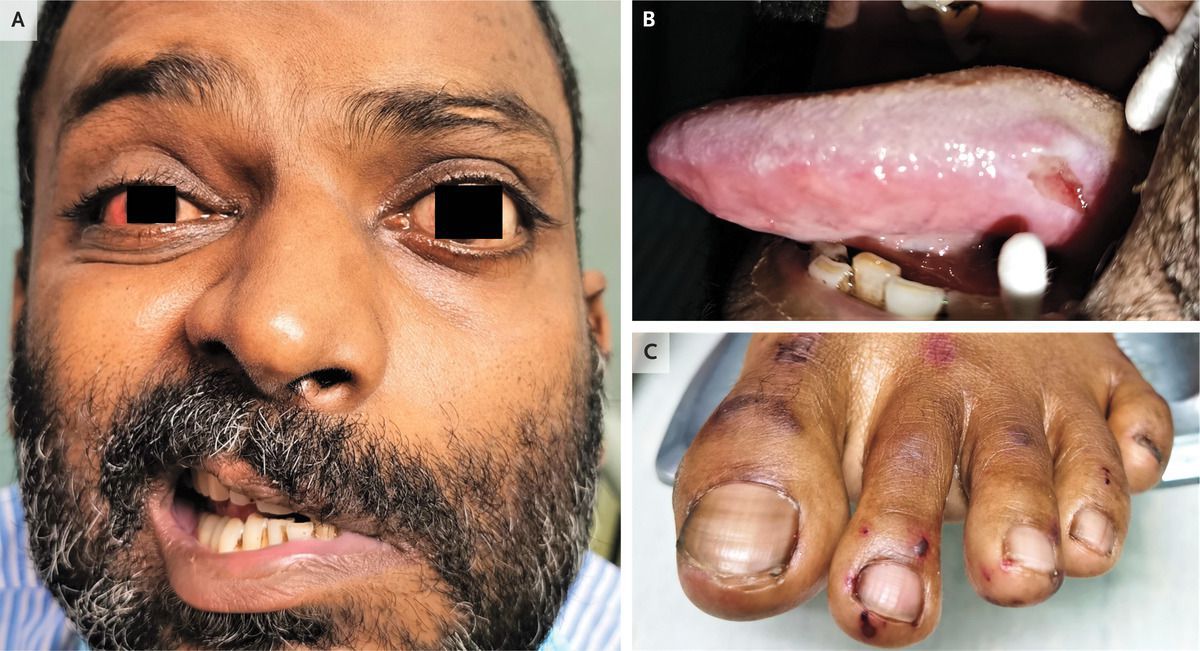 A 42-year-old man presented to the ophthalmology clinic with 5 days of pain and redness in both eyes. He reported no history of asthma but had recently received a diagnosis of otitis media and sensorineural hearing loss at the otolaryngology clinic. Physical examination showed anterior scleritis in the right eye, episcleritis in the left eye, facial-nerve palsy on the left side (Panel A), a large ulcer on the lateral side of the tongue (Panel B), and hemorrhagic petechiae on both feet, including the toes (Panel C). Laboratory studies showed an absolute eosinophil count of 2220 per cubic millimeter (reference range, 20 to 500), positivity for perinuclear antineutrophil cytoplasmic antibody, and a proteinase 3 antibody concentration of 237 U per milliliter (reference value, <18). Biopsy of skin from the foot revealed leukocytoclastic vasculitis with marked perivascular infiltration of eosinophils mixed with neutrophils. A diagnosis of eosinophilic granulomatosis with polyangiitis was made. All the antineutrophil cytoplasmic antibody–associated vasculitides may involve the eyes, peripheral nerves, skin, and oral mucosa, but eosinophilic granulomatosis with polyangiitis is typically distinguished by the presence of asthma and tissue and peripheral eosinophilia. Treatment with systemic glucocorticoids and cyclophosphamide was initiated, and at 6 months of follow-up, all the patient’s symptoms except the facial droop had resolved.