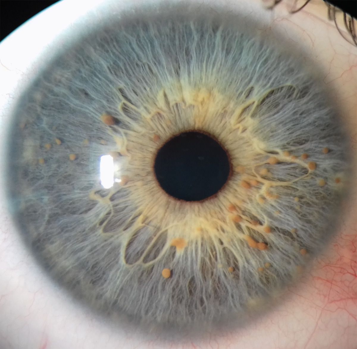 A 40-year-old man with a history of neurofibromatosis type 1 presented to the ophthalmology clinic for a yearly refractive eye examination. He reported no eye symptoms or changes in his vision. An examination of the anterior segment of each eye showed multiple light-brown iris nodules consistent with Lisch nodules. Lisch nodules are melanocytic hamartomas that are common in patients with neurofibromatosis type 1, and their prevalence and number increase with age. Unlike iris nevi, which are flat or minimally elevated with blurred margins, Lisch nodules are elevated above the surface of the iris, have well-defined borders, and occur in multiples. They are part of the diagnostic criteria for neurofibromatosis type 1 and may help to establish the diagnosis in young patients who have few other manifestations of the condition. Because Lisch nodules are not known to result in any ophthalmologic symptoms or complications, no specific treatment was advised. The patient continues to undergo routine annual eye examinations and follow-up with a multidisciplinary neurofibromatosis team.