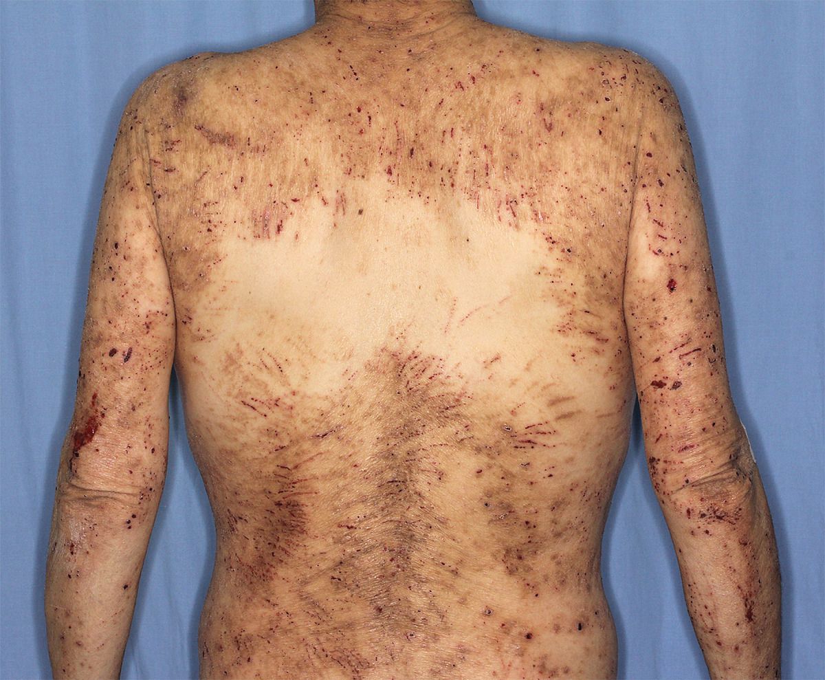 A 57-year-old man presented to the dermatology clinic with a 1-month history of itching of the whole body, malaise, and muscle cramps. He had received a diagnosis of renal insufficiency 1 year earlier but had been lost to follow-up. A physical examination showed diffuse skin hyperpigmentation and scattered excoriations across his body except for an area in the midscapular region. Laboratory studies showed a blood urea nitrogen level of 128 mg per deciliter (46 mmol per liter; reference range, 8 to 20 mg per deciliter [3 to 7 mmol per liter]) and a serum creatinine level of 15.2 mg per deciliter (1344 μmol per liter; reference range, 0.4 to 1.2 mg per deciliter [35 to 106 μmol per liter]). Computed tomography of the abdomen showed atrophy of both kidneys. Chronic generalized pruritus due to chronic kidney disease was diagnosed. In patients with chronic generalized pruritus, a condition with various possible causes, a butterfly-shaped area of the upper back where a patient cannot reach — also known as the acnestis — may be spared the skin changes that occur as a result of frequent scratching or rubbing. In this case, hemodialysis was initiated, and the pruritus and skin changes abated within 2 months.