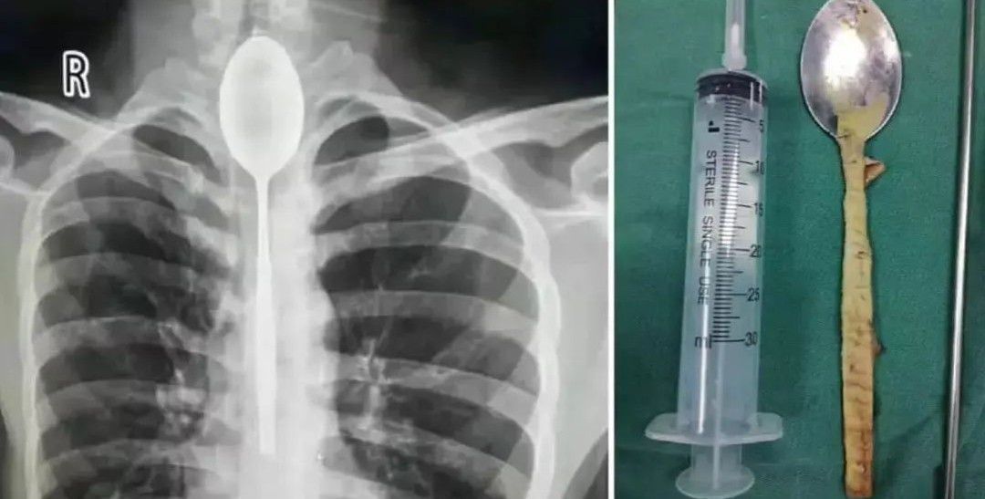 A man had a steel spoon stuck in his esophagus for an entire year! He swallowed the spoon because he was dared to do so. The steel spoon was lodged in his esophagus for a year. Surprisingly, the half-swallowed spoon wasnot causing much discomfort to this man. The spoon got stuck in his esophagus promptly. In addition, even after several months passed, this man did not think the irritation was serious enough to seek medical help. However, all of that changed a year later. A week before reporting to the hospital, the man started experiencing a difficulty breathing after he was punched in the chest and started having chest pain. Doctors performed the procedure and two hours later a spoon which measured around 8 inches was finally removed from the patient’s esophagus. .