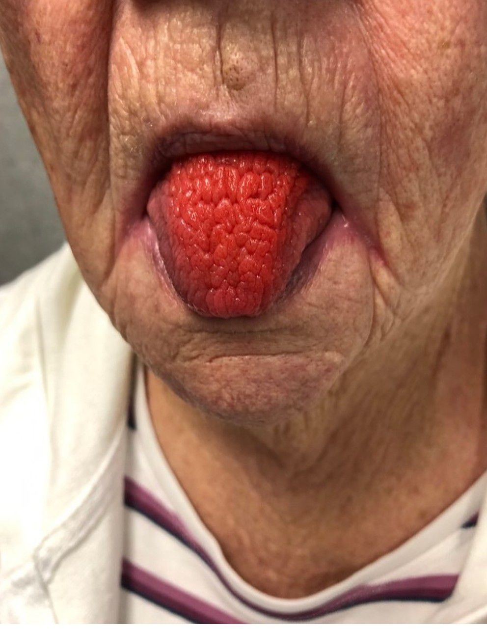 This is not Kawasaki nor strawberry tongue & faraway from scarlet fever. This is a septuagenarian pt with high-prob 38% immune deficiency. To understand this patient condition reviewing PMH and temp is primordial, but given the fact that it’s just a visual diagnosis, If we observe the patient in more depth (/Red like-tomato cracked tongue which gradually differ from strawberry-like tongue; light-pink chin; reddish skin tone:>^which indicates elevated temperature & excessive fold of the skin which indicates mid to excessive anxiety & stress with a wide inexistant surrounding lips which leaves to know the patient might have anorexia. TO CONCLUDE^ **this patient is 99.8% [YIN deficiency]