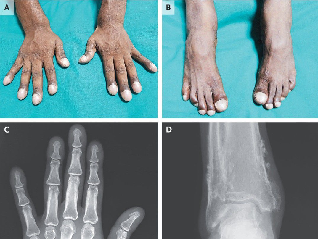 A 31-year-old man presented to the internal medicine clinic with 10 years of progressive enlargement of his fingertips and toes and intermittent aches in his distal forearms and lower legs. He had no clinically significant medical history or family history of similar symptoms. Finger and toe clubbing, with a supranormal angle of 210 degrees between the nail bed and the proximal nail fold, was observed on examination. Hyperpigmentation of the proximal nail folds; tenderness to palpation of the distal forearms and lower legs, fingertips, and toes; and widening of the distal forearms and lower legs (Panels A and B, respectively) were also observed. There was no skin thickening or hyperhidrosis. Radiographs of the fingers showed bony proliferation at the tips of the phalanges (Panel C), and radiographs of the ankles showed increased periosteal bone formation at the distal tibia and fibula (Panel D). Serum laboratory tests (including thyroid-function studies), an echocardiogram, and whole-body positron-emission tomography–computed tomography were normal. The patient received a diagnosis of primary hypertrophic osteoarthropathy, a hereditary syndrome characterized by clubbing, periosteal bone proliferation, and (not seen in this case) facial skin thickening and hyperhidrosis, in the absence of systemic conditions. The patient was initially treated with nonsteroidal antiinflammatory drugs for 3 months. Given persistent symptoms, zoledronic acid was administered, and his pain had abated at follow-up 2 months later.