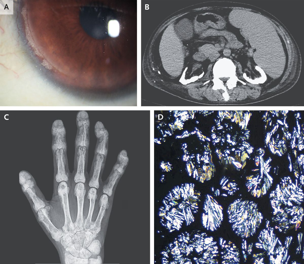 A 40-year-old man with end-stage kidney disease and calcium oxalate nephrolithiasis presented to the emergency department with a 7-year history of joint pain. He also reported blurry vision, painful skin lesions, and tooth loss, all of which had developed over the past several years. Physical examination was notable for the absence of incisors and the presence of synovitis of the elbows, knees, and ankles; deformities of the finger joints; and tender subcutaneous nodules on the back and the legs. Corneal calcium deposits were seen on slit-lamp examination (Panel A). Computed tomography of the abdomen showed nephrocalcinosis in both kidneys (Panel B), and radiography of the hands showed dense metaphyseal bands and calcium deposits in the soft tissues (Panel C). A biopsy specimen of a subcutaneous nodule showed calcium oxalate deposition with birefringence on polarized microscopy (Panel D). Two AGXT variants were observed on genetic testing, and a diagnosis of primary hyperoxaluria type 1 was made. Primary hyperoxaluria is a rare autosomal recessive disorder involving the overproduction of oxalate by the liver that may go undiagnosed for years. Early symptoms include nephrocalcinosis and nephrolithiasis. As kidney function worsens, systemic oxalate deposition may occur, including in the joints, bones, eyes, and skin. The patient had been undergoing hemodialysis, and his joint pain abated when the frequency of treatment was increased. He is undergoing evaluation for liver and kidney transplantation.