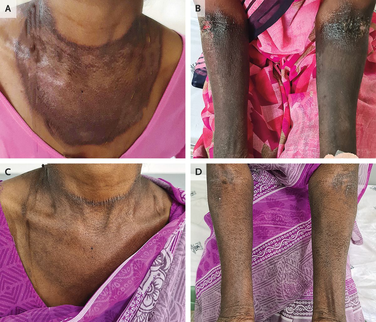 A 48-year-old woman presented to the general medicine clinic with a 6-month history of a worsening rash on her neck and arms. She also reported having diarrhea, fatigue, and loss of appetite, with an 8-kg weight loss over the same period; she had no neurologic symptoms. The patient lived in rural India, adhered to a vegetarian diet, and did not use alcohol. On physical examination, there were well-demarcated areas of hyperpigmentation on the sun-exposed areas of her neck and anterior chest (Panel A) and forearms (Panel B), with skin fissures in the antecubital fossa. Serum niacin testing was unavailable. A diagnosis of pellagra, or niacin deficiency, was made on the basis of the patient’s syndrome of diarrhea and symmetric, photosensitive dermatitis, including a typical Casal’s necklace rash. Pellagra that is caused by dietary deficiency persists in resource-limited countries, whereas it is associated more with alcohol use, bariatric surgery, or malabsorptive conditions in resource-rich countries. After the patient was treated with intravenous vitamin B complex followed by oral supplementation, the diarrhea resolved and the skin hyperpigmentation was reduced at follow-up 4 weeks later (Panels C and D).