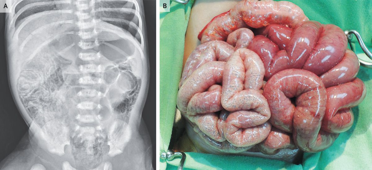An 11-day-old boy born at 39 weeks of gestation presented to the emergency department with watery diarrhea, bilious emesis, progressively worsening abdominal distention, and shock. There had been no complications during his birth, and he had been growing appropriately while receiving breast milk. The oxygen saturation was 82% while he was breathing ambient air; the blood pressure could not be measured. On physical examination, general cyanosis and subcostal retractions were present, and there were no audible bowel sounds. Abdominal radiography revealed gas in the bowel wall, a finding known as pneumatosis intestinalis (Panel A). The patient’s trachea was intubated, and treatment with broad-spectrum antibiotic agents, intravenous fluids, and vasopressors was initiated. Because of worsening symptoms associated with shock, an exploratory laparotomy was performed. Gas bubbles were seen within the walls of the small and large intestines (Panel B), a finding consistent with the diagnosis of necrotizing enterocolitis. Necrotizing enterocolitis is a life-threatening ischemic necrosis of the intestines that is most commonly seen in premature infants; however, certain conditions, such as congenital cardiac disease, can confer a predisposition to necrotizing enterocolitis in full-term infants. During the operation, the patient became pulseless; despite the initiation of cardiopulmonary resuscitation, the patient died. An autopsy was declined by the family.