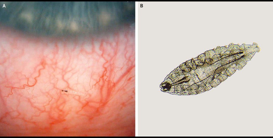 A 53-year-old man presented to the emergency department with itching in the right eye that had been present for several hours. Earlier that day, while gardening near a horse and sheep farm, he had felt something enter his right eye. At presentation, the visual acuity was 20/20 in each eye. Examination of his right eye showed conjunctival hyperemia without purulence and a normal anterior chamber and fundus. More than a dozen mobile, translucent larvae were observed on the cornea, bulbar conjunctiva, and upper and lower conjunctival fornices (Panel A, and see video). There was no intraocular or retinal involvement. A diagnosis of external ophthalmomyiasis — an infestation of the outer structures of the eye by fly larvae — was made. Curative treatment involves mechanical removal of the organisms. In this case, the larvae were removed with forceps and identified as Oestrus ovis, also known as the sheep bot fly, which had presumably flown into the patient’s eye and deposited the larvae (Panel B). Because the larvae were numerous and can cause superficial corneal abrasions with their cephalic oral hooks and body spicules, the patient was treated with prophylactic topical antibiotic agents. At follow-up 10 days later, his symptoms had resolved.