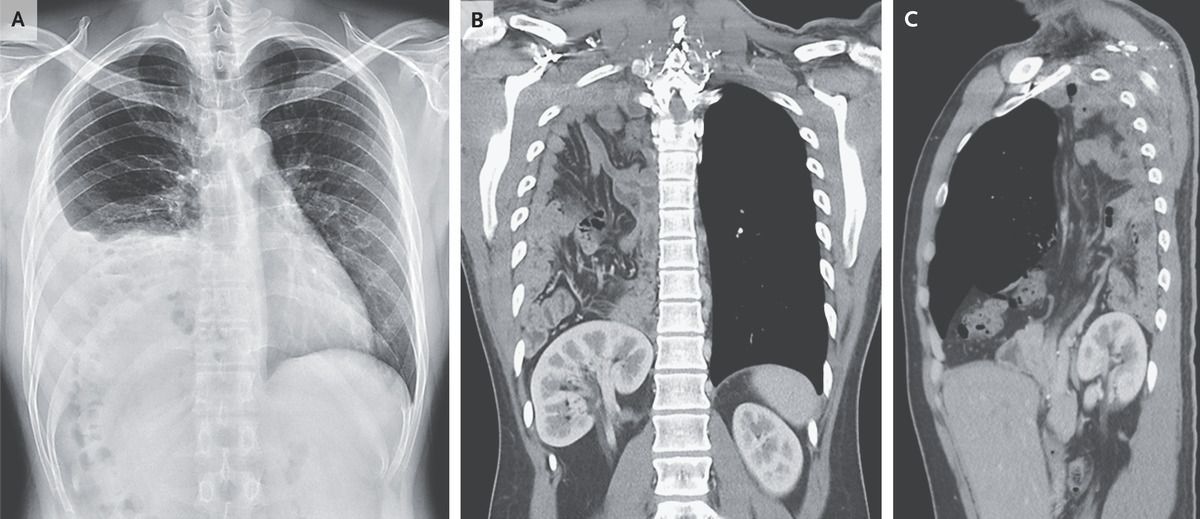 A 25-year-old man was referred to the emergency department owing to abnormal results on a chest radiograph obtained during a preemployment examination. He had no known medical history and no symptoms. His respiratory rate was 14 breaths per minute, and his oxygen saturation was 100% while he was breathing ambient air. On examination, there were decreased breath sounds at the base of the right lung. The abdomen was not tender. A radiograph of the chest showed a possible right pleural effusion, elevated right hemidiaphragm, and suspected translocation of the colon into the right upper quadrant of the abdomen (Panel A). Computed tomography of the chest with the use of contrast material revealed herniation of the right kidney, omentum, and small and large intestines into the right thoracic cavity through a large posterolateral diaphragmatic defect (Panel B shows the coronal view, and Panel C the sagittal view). There were no signs of bowel obstruction. A diagnosis of congenital diaphragmatic hernia due to a posterolateral diaphragmatic defect — also called a Bochdalek hernia — was made. Bochdalek hernia is typically diagnosed in infants and children, who present with respiratory distress. In rare cases, the hernia may remain asymptomatic until adulthood, at which time complications of bowel strangulation or obstruction may occur. The patient declined surgical repair of the diaphragmatic defect and was subsequently lost to follow-up.