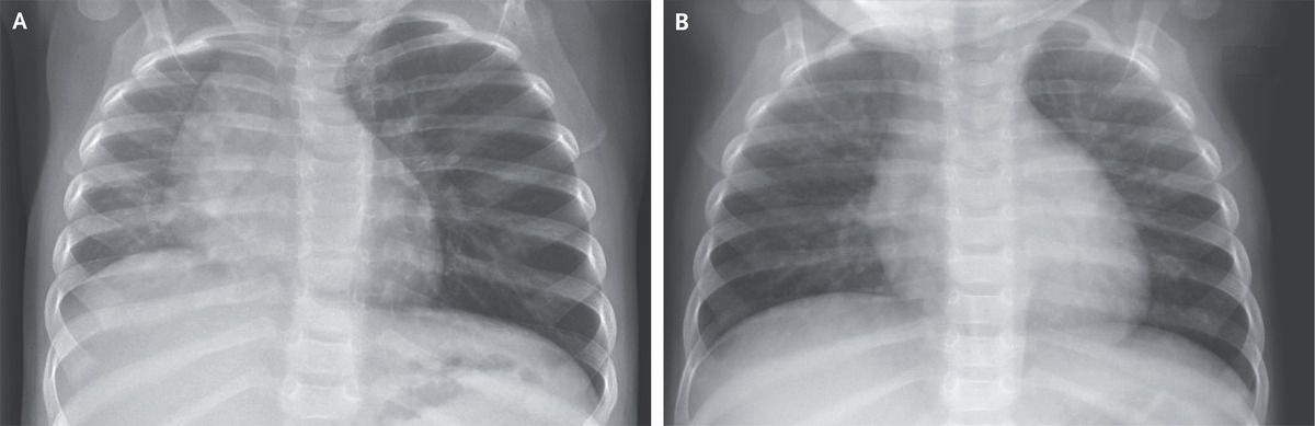 A healthy 12-month-old girl was brought to the emergency department with a 4-hour history of coughing and stridor. Four hours earlier, she had choked while eating. Her respiratory rate was 38 breaths per minute, and her oxygen saturation was 98% while she was breathing ambient air. On examination, she appeared well. No cough or stridor was observed. Crackles and wheezing were heard in the right lung, and the left lung was clear. A chest radiograph showed opacification and volume loss in the right lung, rightward shift of the mediastinum, and hyperinflation of the left lung (Panel A). Given the abnormal radiographic appearance of the right lung, there was concern about right-airway obstruction. However, during rigid bronchoscopy, a foreign body was removed from the left mainstem bronchus. Partial airway obstruction in the left mainstem bronchus had resulted in hyperinflation on that side, with passive atelectasis and opacification on the right side. Foreign-body aspiration in children is potentially life-threatening. It is important to note that chest radiographs may appear normal when radiolucent objects are aspirated. High clinical suspicion of foreign-body aspiration should prompt bronchoscopy in order to avoid acute and chronic complications. A repeat chest radiograph in this patient was normal (Panel B), but her course was complicated by pneumonia, which abated with antimicrobial treatment.