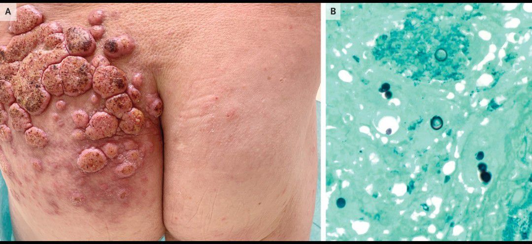 A 53-year-old man presented to the dermatology clinic with a 4-month history of red, raised, itchy skin lesions on his left lower back and buttock. He had no known medical history and reported no constitutional or respiratory symptoms. He worked as a landscaper, often sustaining skin abrasions while trimming trees. The physical examination showed numerous verrucous nodules and plaques with overlying crusting and surrounding erythema on the left lower back and buttock (Panel A). Histopathological studies showed pseudoepitheliomatous hyperplasia with an intraepidermal and dermal infiltrate composed of neutrophils, lymphocytes, histiocytes, and eosinophils, as well as multinucleated giant cells with granuloma formation. Grocott–Gomori methenamine silver staining showed broad-based budding fungal organisms (Panel B), a finding consistent with Blastomyces dermatitidis. The result of a urine antigen test for blastomyces was also positive. Chest imaging showed no abnormalities. The patient received a diagnosis of primary cutaneous blastomycosis, which is caused by blastomyces species, dimorphic fungi found in the eastern half of the United States that typically grow in soil and detritus from wooded areas. Cutaneous manifestations usually indicate disseminated disease but rarely may occur by means of primary inoculation, as in this case. Itraconazole therapy was prescribed, and after 6 months the skin lesions had resolved.
