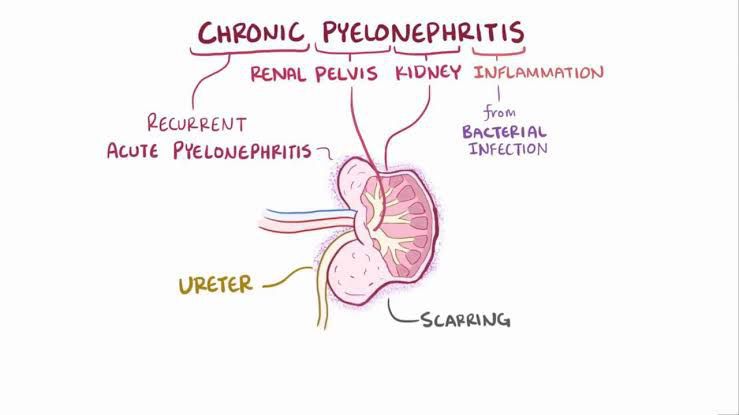 Chronic pyelonephritis is characterized by inflammation and scarring induced by recurrent or persistent kidney infection, vesicoureteral reflux, or other causes of urinary tract obstruction. It occurs almost exclusively in patients with major anatomic anomalies, most commonly young children with vesicoureteral reflux (VUR). The diagnosis of chronic pyelonephritis is made on the basis of imaging studies such as ultrasound or CT scanning. Treatment options include prophylactic antibiotics, endoscopic injection of dextranomer hyaluronic acid, and antireflux surgery. [4] Selecting the treatment option for different grades of VUR reflux depends on the clinical presentation and renal function.