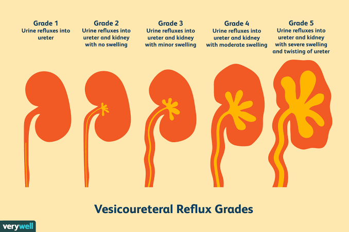 Vesicoureteral reflux (VUR), or the retrograde flow of urine from the bladder into the ureter, is an anatomic and functional disorder that can result in substantial morbidity, both from acute infection and from the sequelae of reflux nephropathy. VUR is classified into 5 grades (I-V), according to the increasing degree of reflux as follows [3] : Grade I: ureter only Grade II: ureter, pelvis, and calyces; no dilatation; normal calyceal fornices Grade III: mild or moderate dilatation and/or tortuosity of the ureter and mild or moderate dilatation of the renal pelvis; no or only slight blunting of the fornices Grade IV: moderate dilatation and/or tortuosity of the ureter and moderate dilatation of the renal pelvis and calyces; blunting of the sharp angle of the fornices but maintenance of the papillary impressions in the majority of calyces Grade V: gross dilatation and tortuosity of the ureter; severe dilatation of the renal pelvis and calyces; the papillary impressions are no longer visible in the majority of calyces