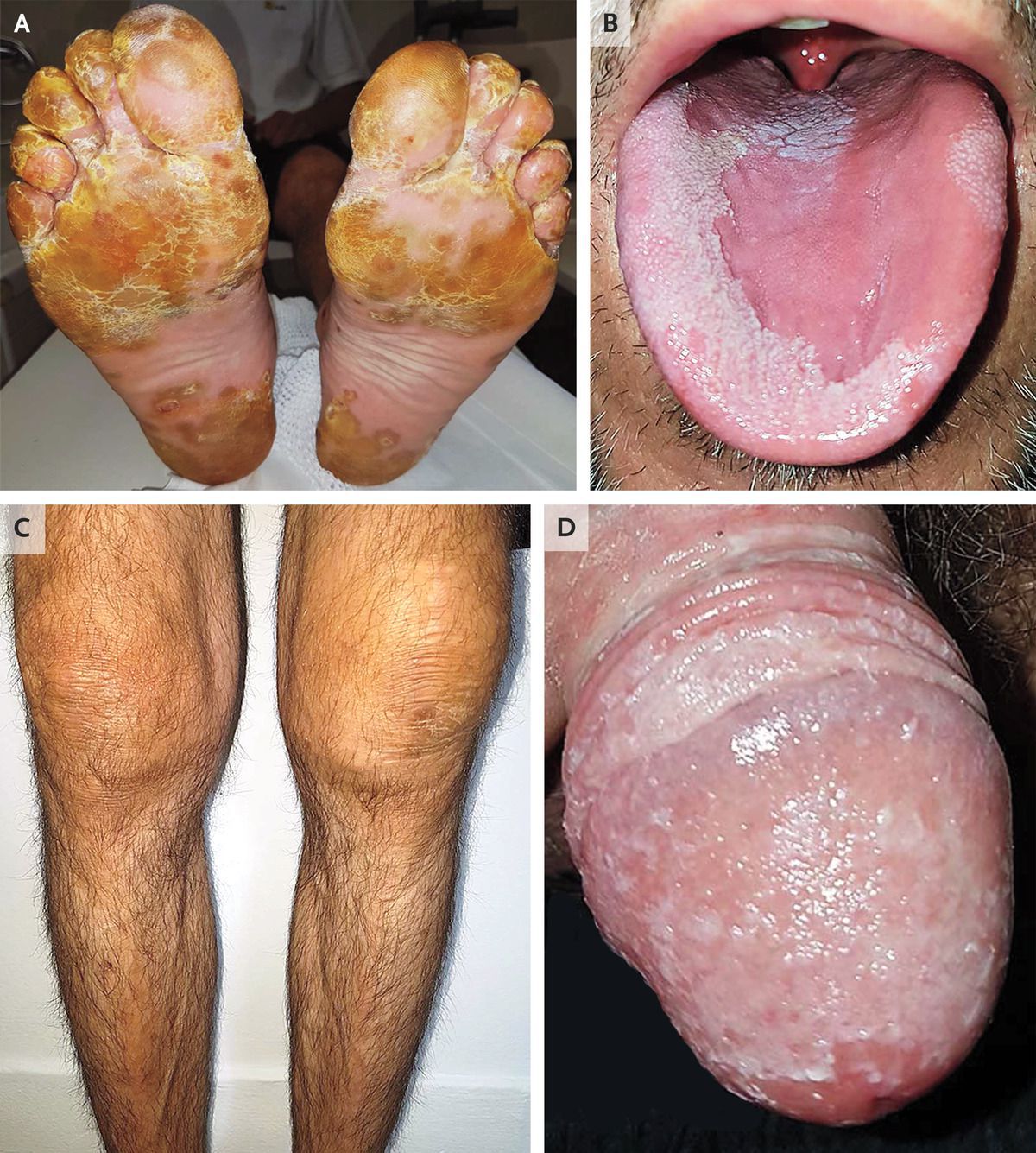 A 40-year-old man presented to the dermatology clinic with a 2-week history of a scaly foot rash, joint swelling, and low back pain. He had no known medical history but had had diarrhea and urethral discharge 7 days before the onset of his current symptoms. On examination, yellow pustules with hyperkeratosis consistent with keratoderma blenorrhagicum were noted on the plantar surfaces of his feet (Panel A). There were also new psoriatic skin lesions on his scalp, trunk, and dorsal hands, as well as pitting, hyperkeratosis, discoloration, and distal onycholysis on some nails. Other findings included conjunctivitis, migratory glossitis (Panel B), swelling of both knees (Panel C) and the right ankle, and circinate balanitis (Panel D). The C-reactive protein level was 59 mg per liter (reference value, <5), and a urine test was positive for sterile pyuria. Results of an analysis of left-knee synovial fluid were consistent with noninfectious inflammatory arthritis. Tests for rheumatoid factor, Chlamydia trachomatis, and other infectious agents were negative. A diagnosis of reactive arthritis was made. The patient was referred to the rheumatology clinic, and subsequent testing for HLA-B27 was positive. After 5 months of treatment with nonsteroidal antiinflammatory agents, systemic glucocorticoids, and sulfasalazine, the patient’s symptoms abated.